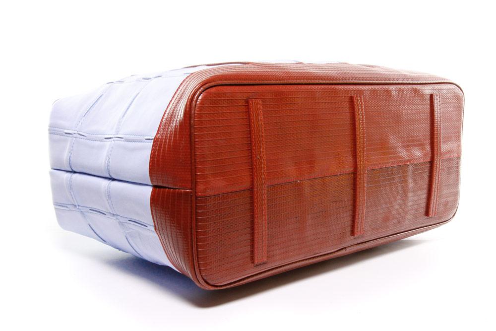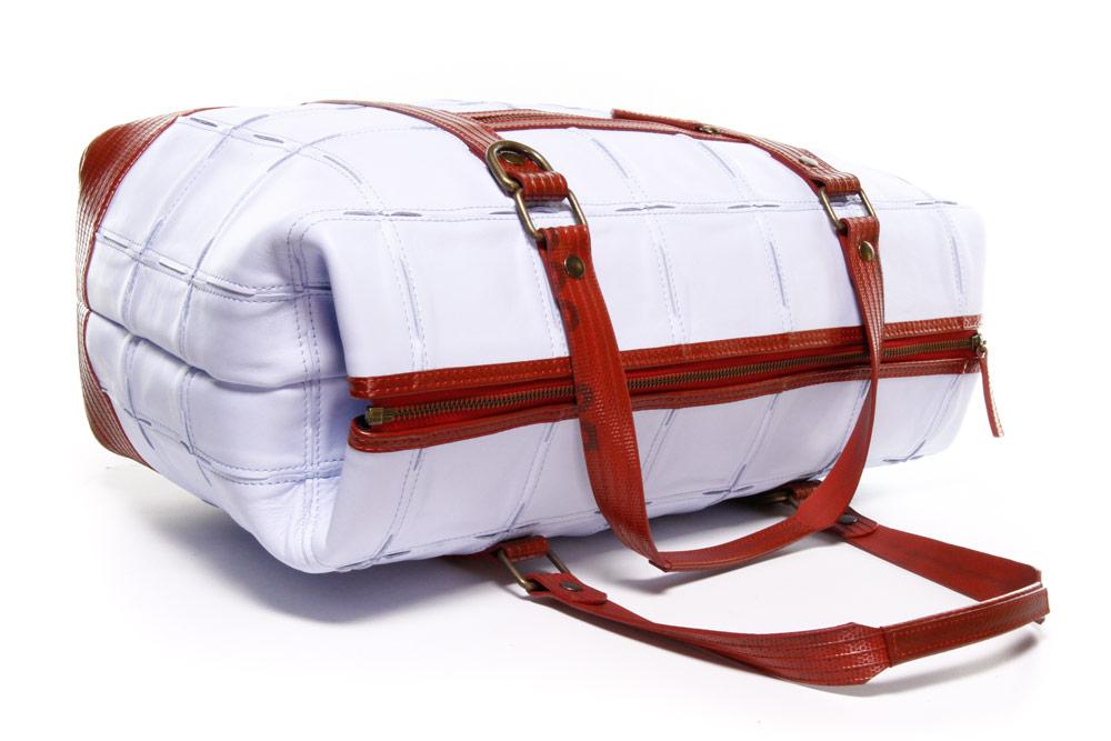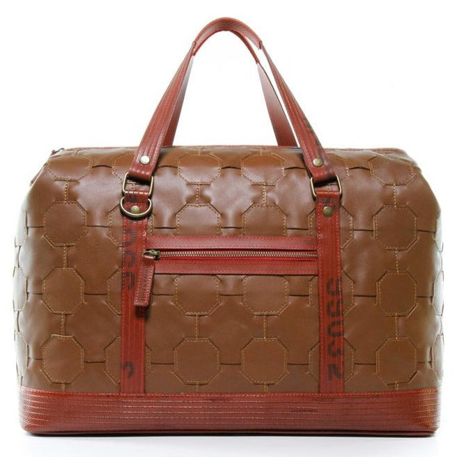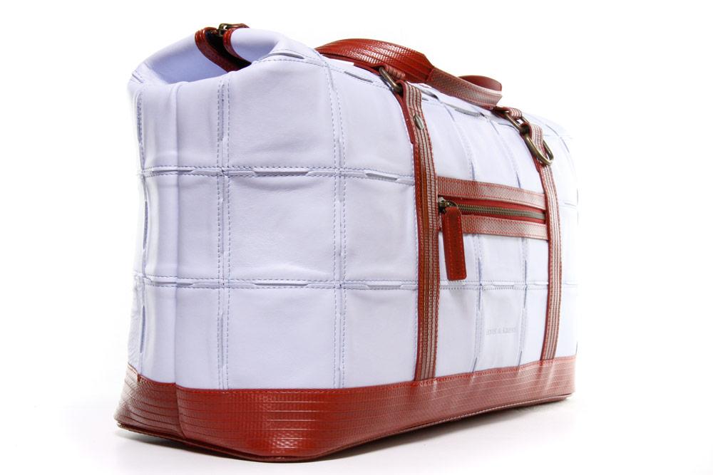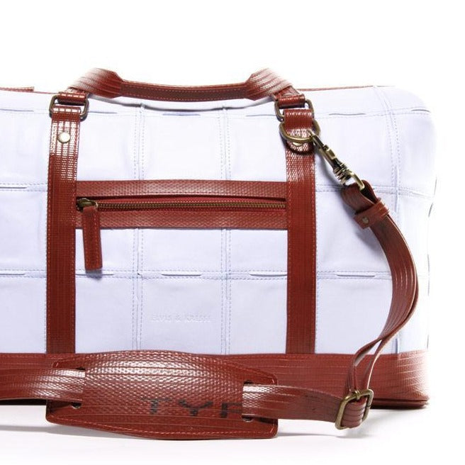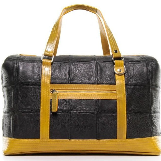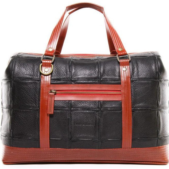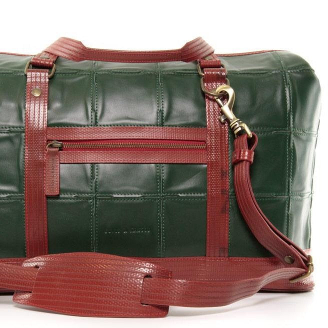 このGladstone Bagは、廃棄された余剰レザーと使用されなくなった消火ホースの生地を使用して、ひとつひとつハンドメイドで作られています。大容量で旅行にぴったのサイズです。